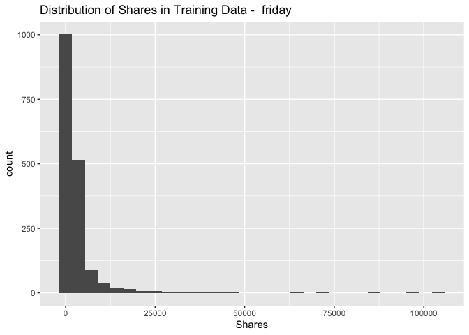 geom_histogram() + xlab("Shares") + ggtitle(paste("Distribution of Shares in Training Data - ",