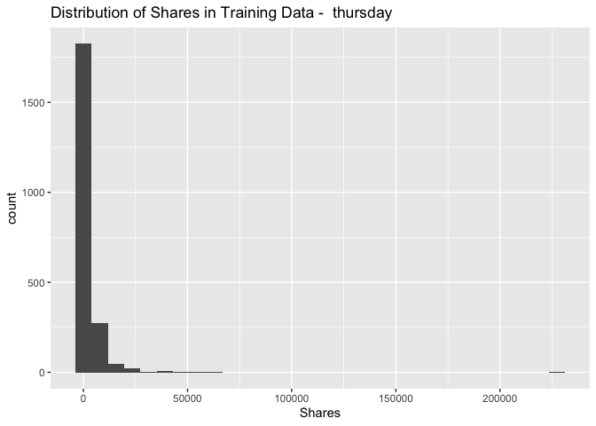 geom_histogram() + xlab("Shares") + ggtitle(paste("Distribution of Shares in Training Data - ",