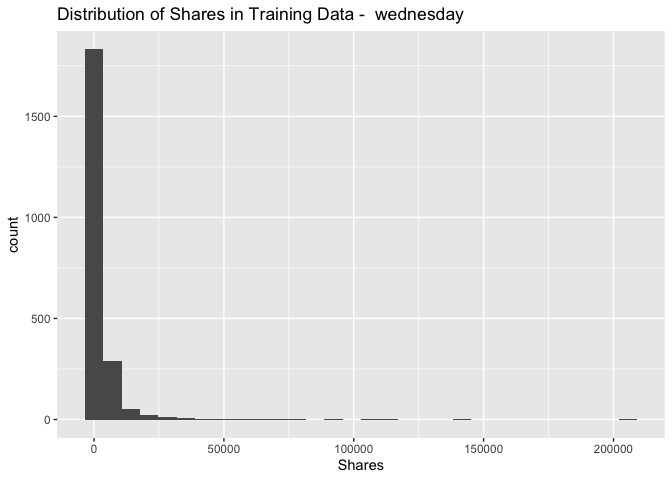 geom_histogram() + xlab("Shares") + ggtitle(paste("Distribution of Shares in Training Data - ",