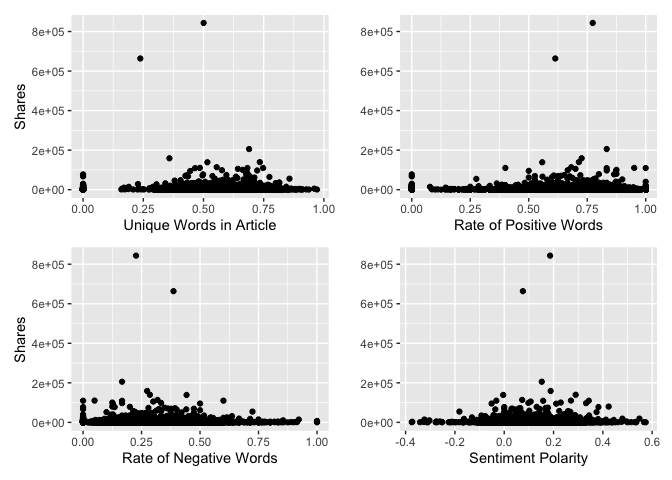 Below is a plot of four interesting variables to the response variable, shares. We want to see if there are any intersting patterns here.